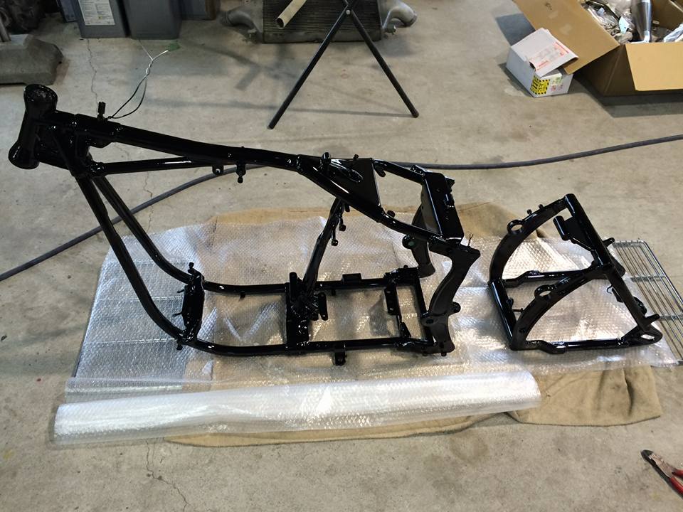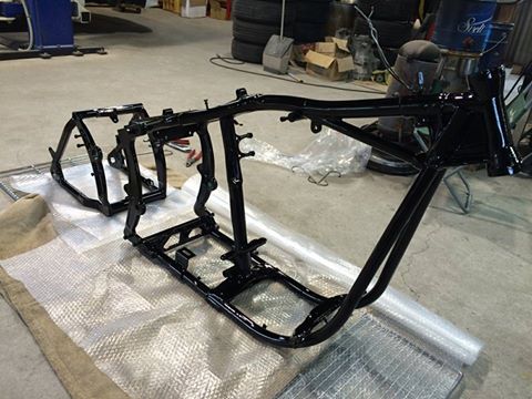 ハーレーダビットソンのフレーム&スイングアームにパウダーコートの施工です。