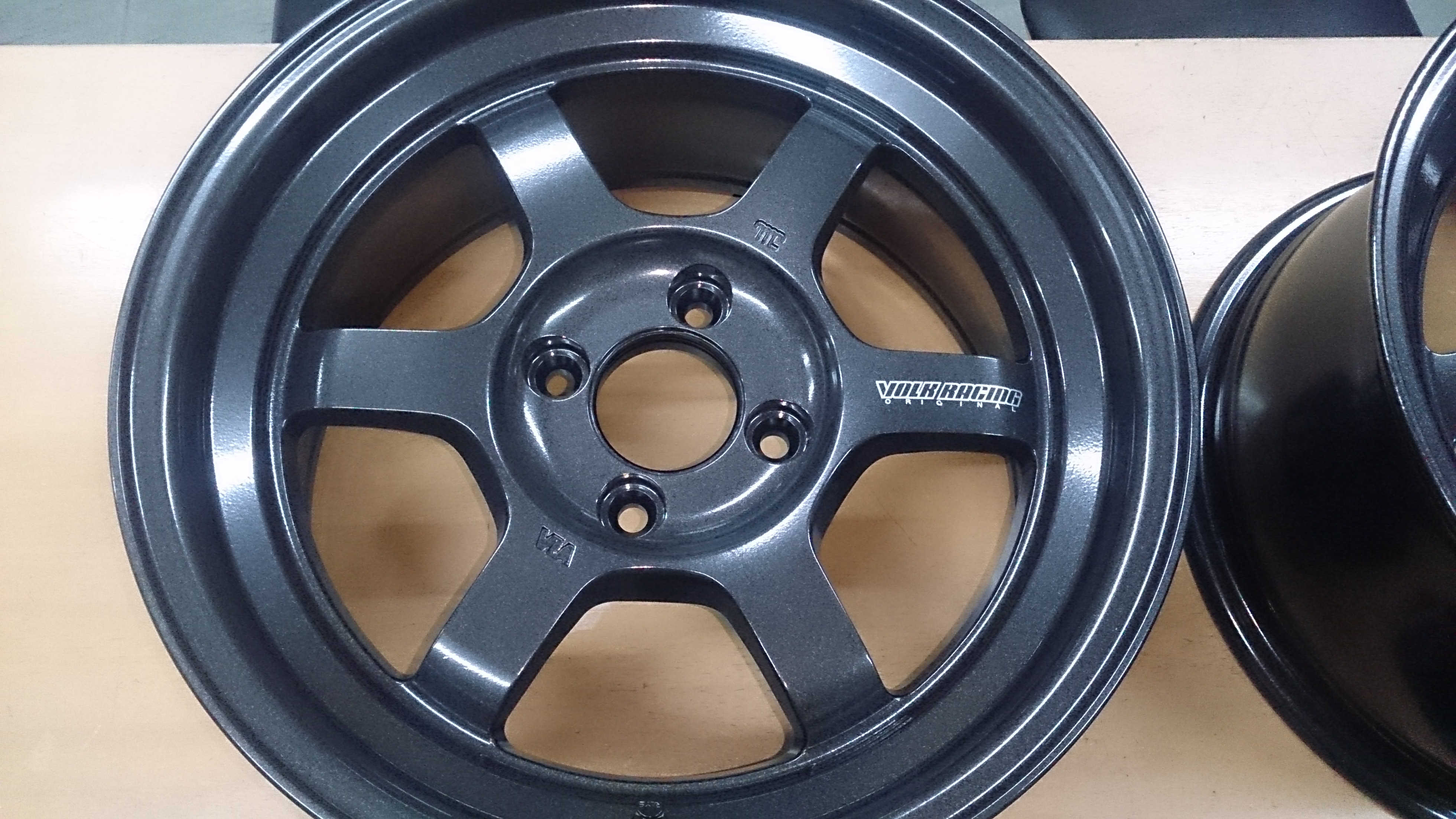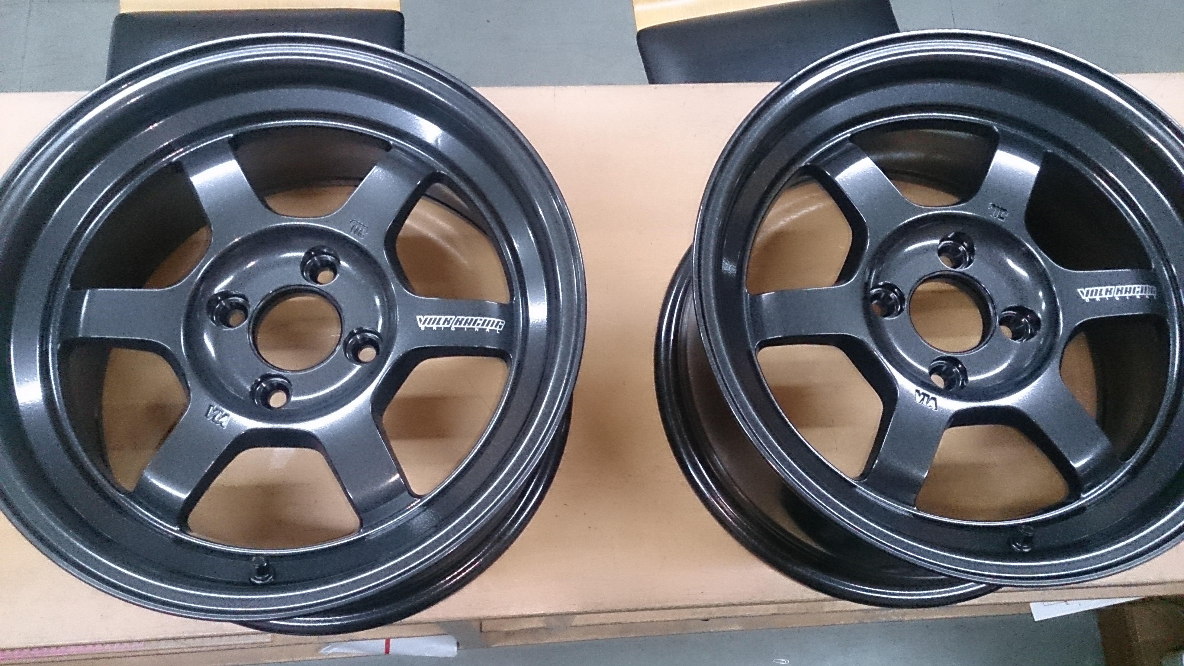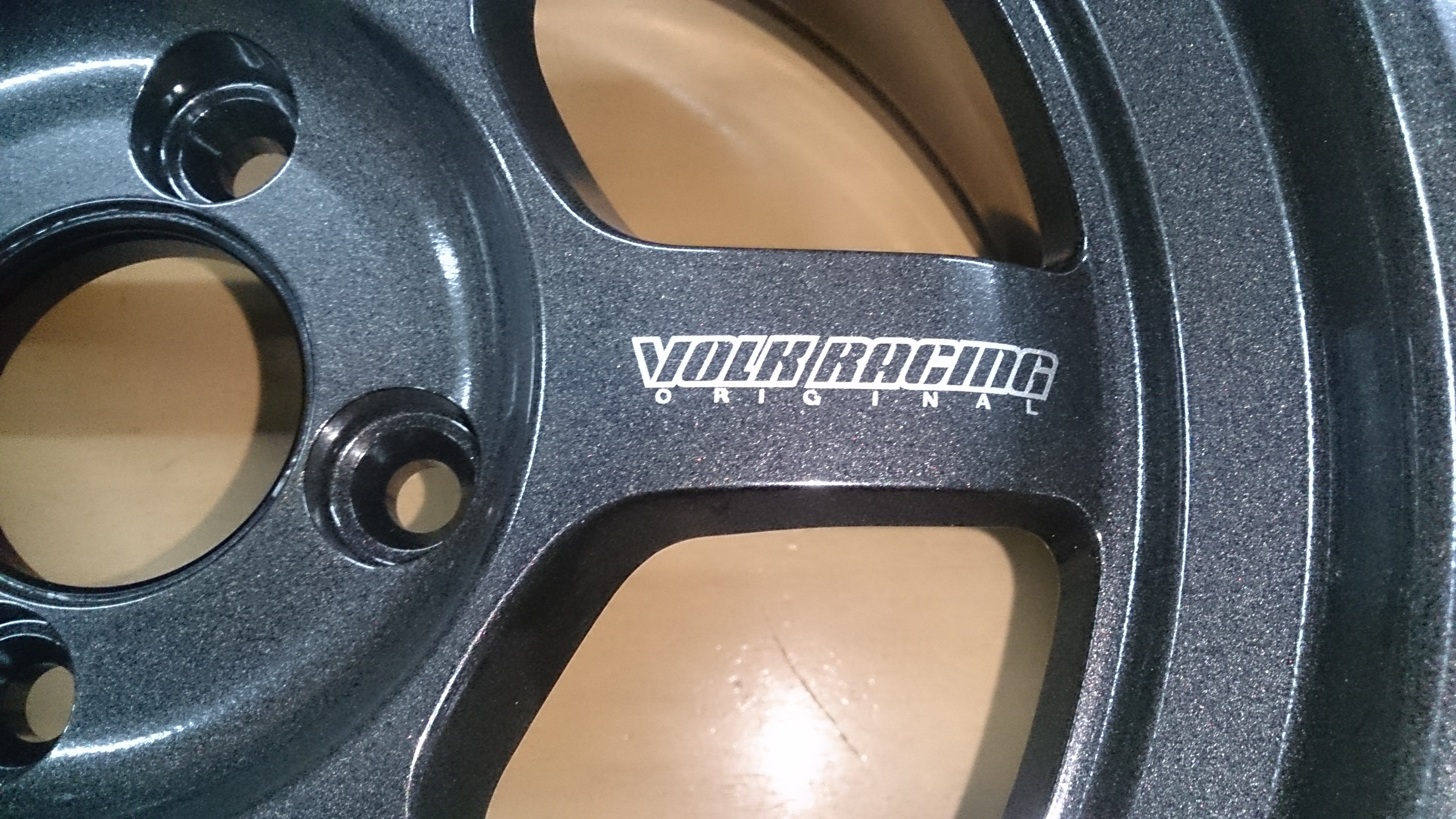 RAYS TE37Vにパウダーコートの施工です。 ブラックメタリックにてコーティングしました。 ボルクレーシングのロゴはカッティングステッカーにて作製。 なかなかクールな仕上がりになりました。